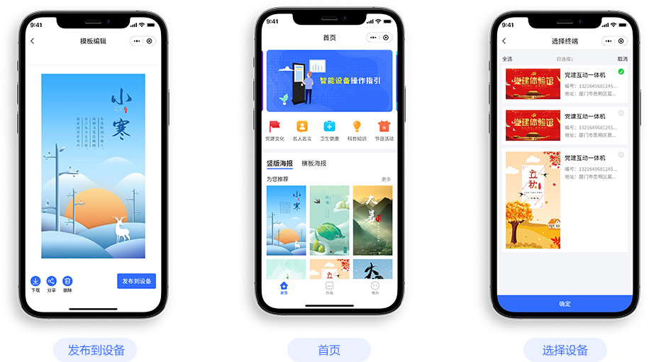 平臺(tái)內(nèi)置近1000+套設(shè)計(jì)模板,覆蓋應(yīng)用場(chǎng)景、包括:節(jié)日宣傳、科普知識(shí)、公告通知、詩(shī)詞鑒賞、節(jié)日活動(dòng)、衛(wèi)生健康等主題。用戶(hù)不僅可以快速修改模板內(nèi)容,還可以插入圖片等操作,并發(fā)布到云屏設(shè)備。